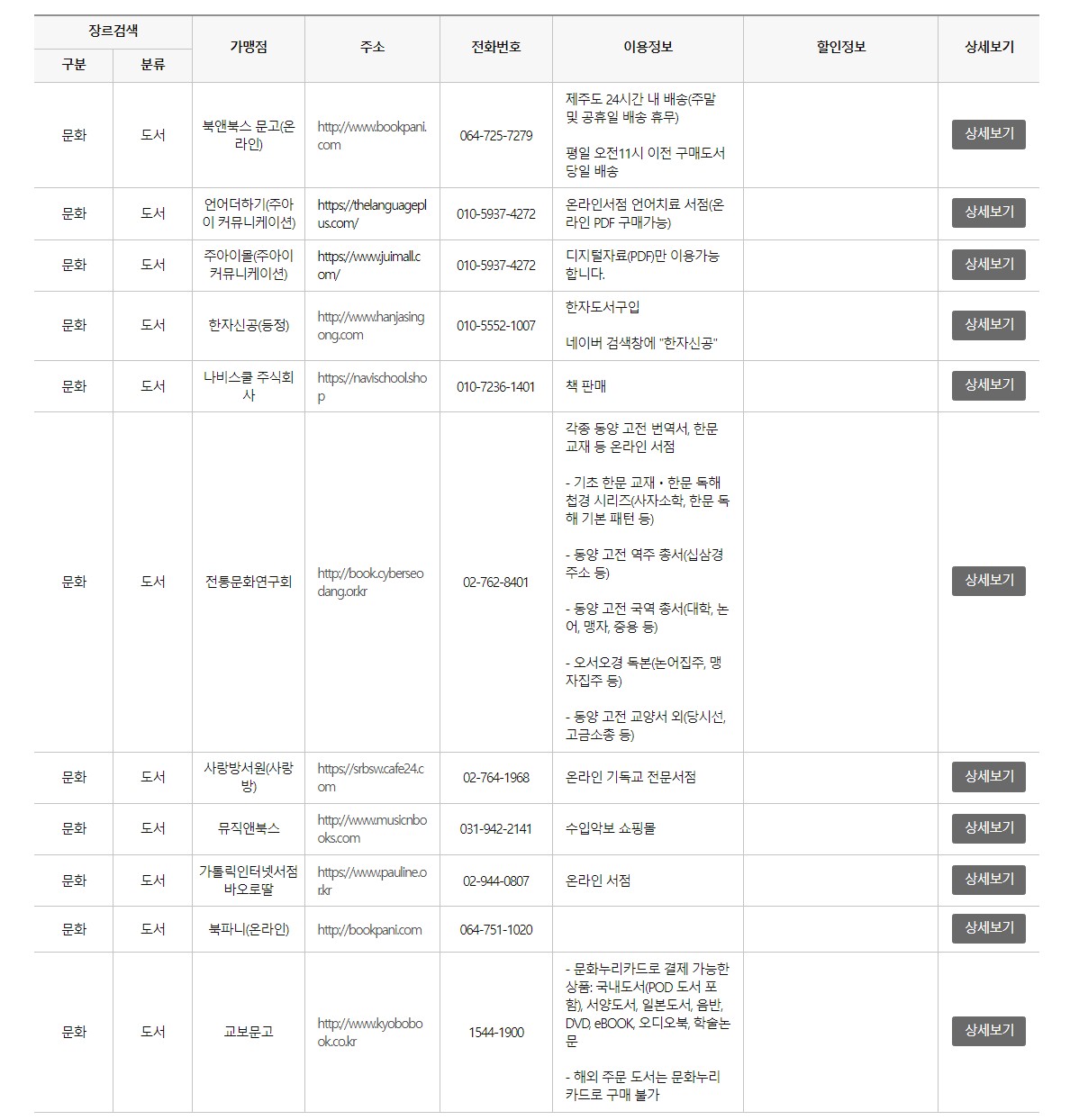 - 교보문고: 온라인 서점으로, 도서 및 문화 상품 구매 시 문화누리카드를 사용할 수 있습니다.