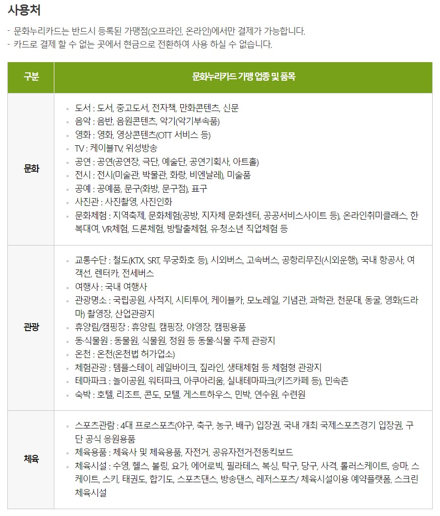 - 스포츠 경기장: 프로야구, 축구 등 스포츠 경기장에서도 문화누리카드 사용이 가능합니다.
