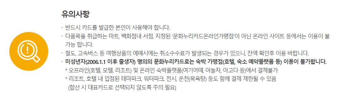 - 여행사 및 숙박업체: 하나투어, 모두투어 등 여행사와 일부 숙박업체에서 여행 상품 구매 시 문화누리카드를 사용할 수 있습니다.